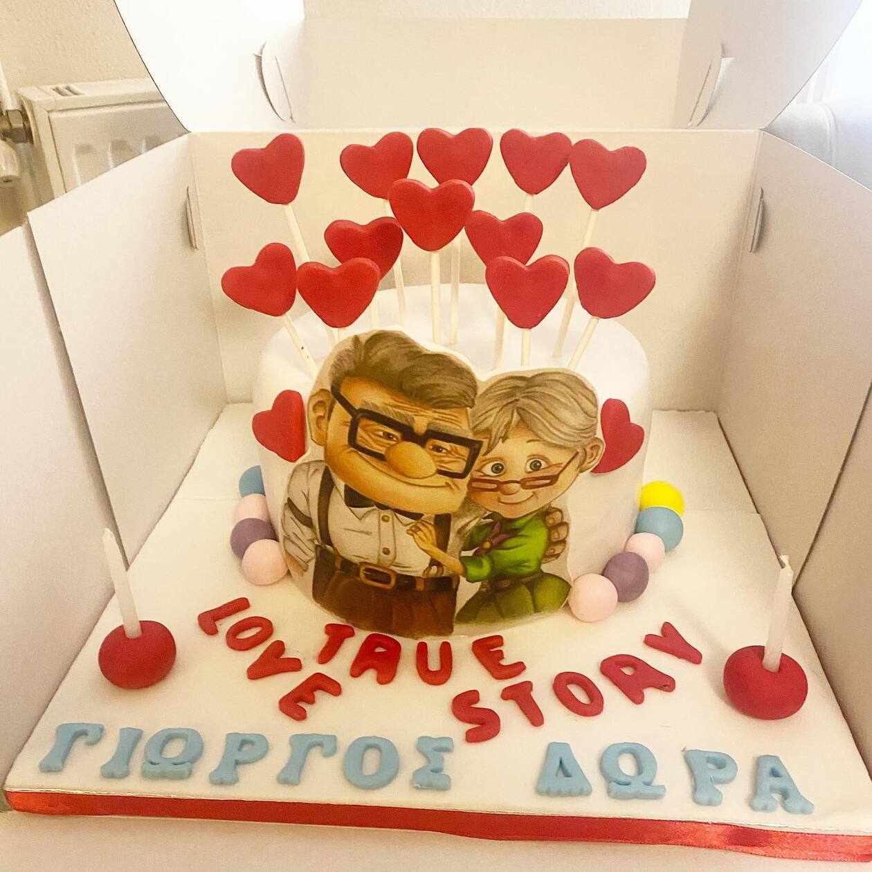 Ο Τσαλίκης και η σύζυγός του επέλεξαν να σβήσουν τα κεράκια σε μια τέλεια τούρτα, η οποία έγραφε πάνω «Αληθινή ιστορία αγάπης… Γιώργος Δώρα».