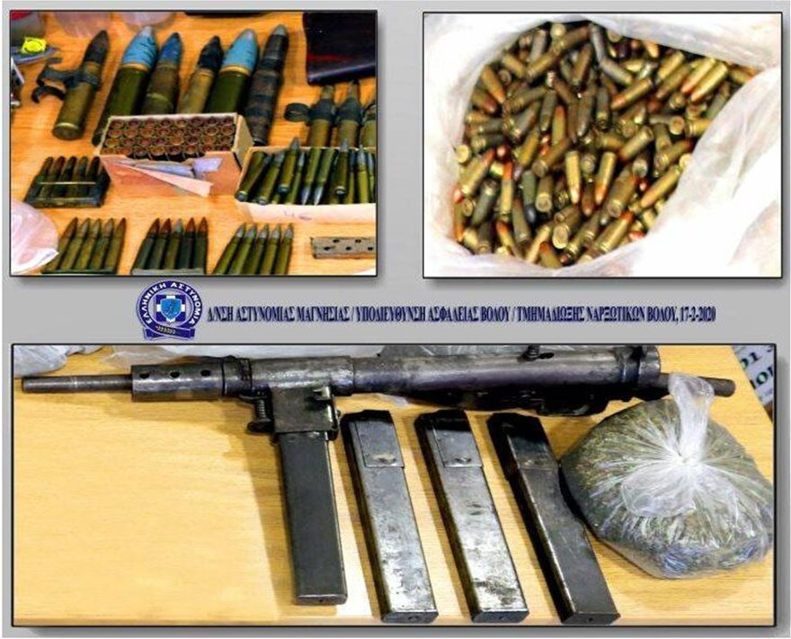Στο σπίτι οι αστυνομικοί εντόπισαν μικρό οπλοστάσιο. Συγκεκριμένα κατασχέθηκαν λειτουργικό πολεμικό τυφέκιο (υποπολυβόλο) με τέσσερις γεμιστήρες χωρίς φυσίγγια, αεροβόλο τυφέκιο, κυνηγετικό όπλο, γεμιστήρας πιστολιού χωρίς φυσίγγια και 461 πολεμικά φυσίγγια, διαφόρων διαμετρημάτων.