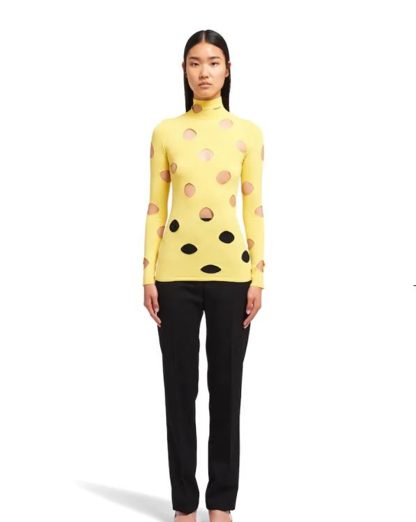 Ο διάσημος ιταλικός οίκος παρουσίασε ένα κίτρινο ζιβάγκο με μεγάλες τρύπες σε διάφορα σημεία και το όνομα Prada κεντημένο στον λαιμό και το κόστος ανέρχεται στα 950 ευρώ και κυκλοφορεί επίσης σε γκρι χρώμα. Το συγκεκριμένο σχέδιο, μπορείτε να το βρείτε στο διαδίκτυο. Μάλιστα, η ιστοσελίδα το περιγράφει ως «ορισμό ενός πολύτιμου ανοιχτού μοτίβου με τρύπες» το οποίο είναι αποτέλεσμα μιας «συνεχιζόμενης δημιουργικής συζήτησης».