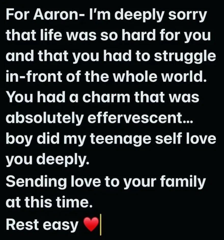 Η Κόρτνεϊ Στόντεν που γνώριζε τον Άαρον έγραψε στο Instagram της: «Μου τηλεφώνησε, μου εκμυστηρεύτηκε αλλά απομακρύνθηκα λόγω απειλών από το περιβάλλον του. Ήλπιζα ότι θα γινόταν καλά, αλλά τώρα είναι εν ειρήνη… Είμαι τόσο στεναχωρημένη».