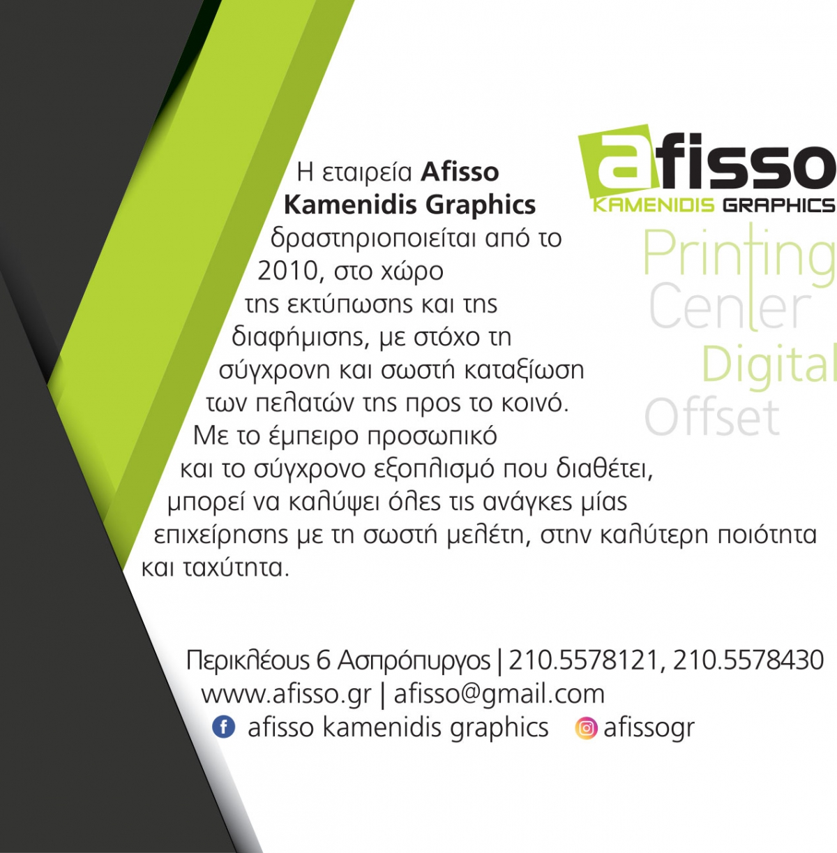 Η εταιρεία «Afisso Kamenidis Graphics» δραστηριοποιείται από το 2010 στο χώρο της εκτύπωσης