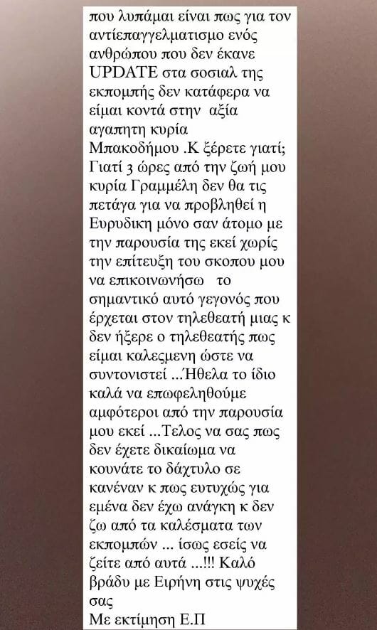 Συγκεκριμένα, ανέφερε στο Ιnstagram: «Ήταν να εμφανιστώ στην εκπομπή της Μαρίας Μπακοδήμου, δεν θα εμφανιστώ όμως γιατί μετά από 8 μήνες – που με παρακαλούν όλες οι εκπομπές να εμφανιστώ και δεν έχω βγει πουθενά- από προσωπική μου πρωτοβουλία, σήμερα προανήγγειλα πως θα βρίσκομαι στην εκπομπή της Μαρίας Μπακοδήμου, χωρίς όμως εκείνοι να έχουν κάνει το σχετικό story και μια αναφορά στο πρόσωπό μου, μέσω των social media.