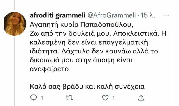 Απαντώντας σε εκείνους που αντέδρασαν αρνητικά για την απόφασή της, η Παπαδοπούλου προχώρησε σε σειρά από tweets στα οποία δεν έκρυψε την έντονη ενόχλησή της.