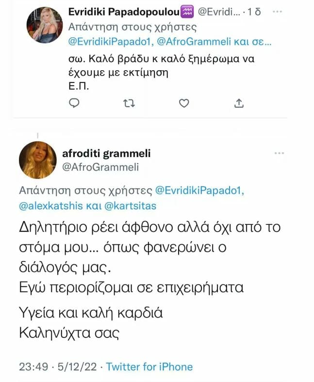 Σε ένα άλλο… τιτίβισμα τόνισε: «Θα έκανε μια σχετική αναφορά στο όνομά μου να επικοινωνήσει πως θα παρευρεθώ κοντά τους. Κακά τα ψέματα είναι δούναι κ λάβειν… όπως έχουν ανάγκη οι εκπομπές τους καλεσμένους τους έχουμε κ εμείς … σχετικός σεβασμός λοιπόν από όλες τις πλευρές είναι αναγκαίος. Μην απορούν λοιπόν…».
