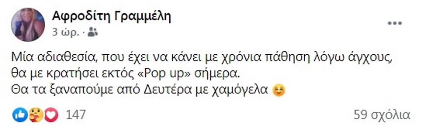 Με απουσίες ξεκίνησε σήμερα το Pop Up αφού από το πάνελ έλειπε η Αφροδίτη Γραμμέλη.