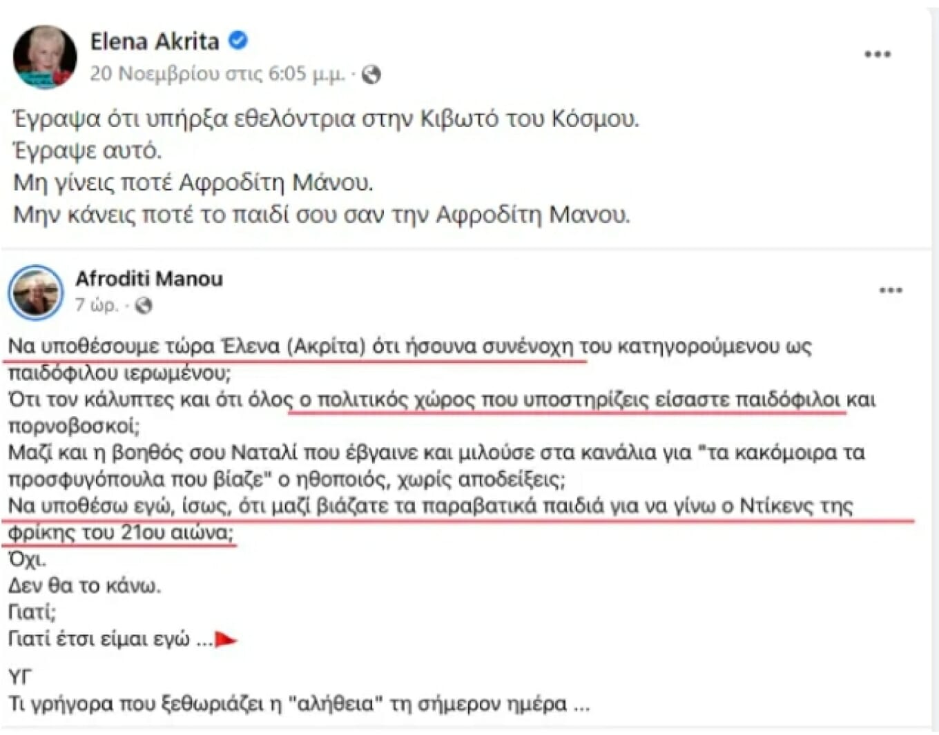 Στους ισχυρισμούς αυτούς είχε απαντήσει η Μάνου με μια αιχμηρή τοποθέτησή της αναφερόμενη σε κριτικές που είχε ασκήσει σε άλλους η Ακρίτα: «Να υποθέσουμε τώρα Έλενα (Ακρίτα) ότι ήσουνα συνένοχη του κατηγορούμενου ως παιδόφιλου ιερωμένου; Ότι τον κάλυπτες και ότι όλος ο πολιτικός χώρος που υποστηρίζεις είσαστε παιδόφιλοι και πορνοβοσκοί; […] Τι γρήγορα που ξεθωριάζει η ‘αλήθεια’ τη σήμερον ημέρα…».