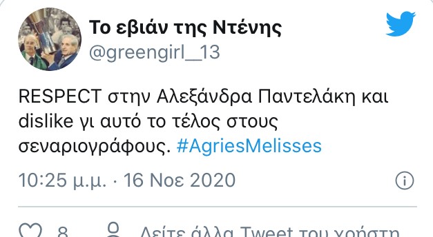 Οι Άγριες Μέλισσες ξεκίνησαν με ένα δυνατό επεισόδιο και ειδικά στις σκηνές της απόδρασης των τεσσάρων φυλακισμένων γυναικών. Η σκηνή που η Φωτεινή πέφτει κάτω νεκρή συγκίνησε το twitter που αποχαιρέτησε την συγκρατούμενη της Ελένης, αλλά και συνεχάρη την ηθοποιό Αλεξάνδρα Παντελάκη για τη συγκλονιστική ερμηνεία της.