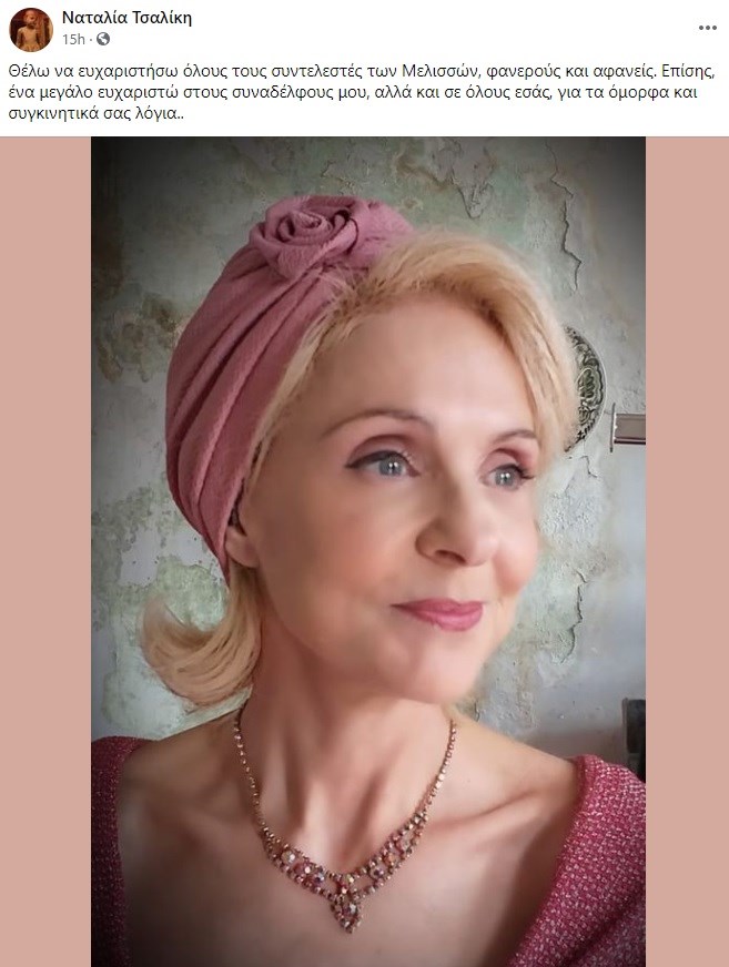«Θέλω να ευχαριστήσω όλους τους συντελεστές των Μελισσών, φανερούς και αφανείς. Επίσης, ένα μεγάλο ευχαριστώ στους συναδέλφους μου, αλλά και σε όλους εσάς, για τα όμορφα και συγκινητικά σας λόγια..», έγραψε η Ναταλία Τσαλίκη.