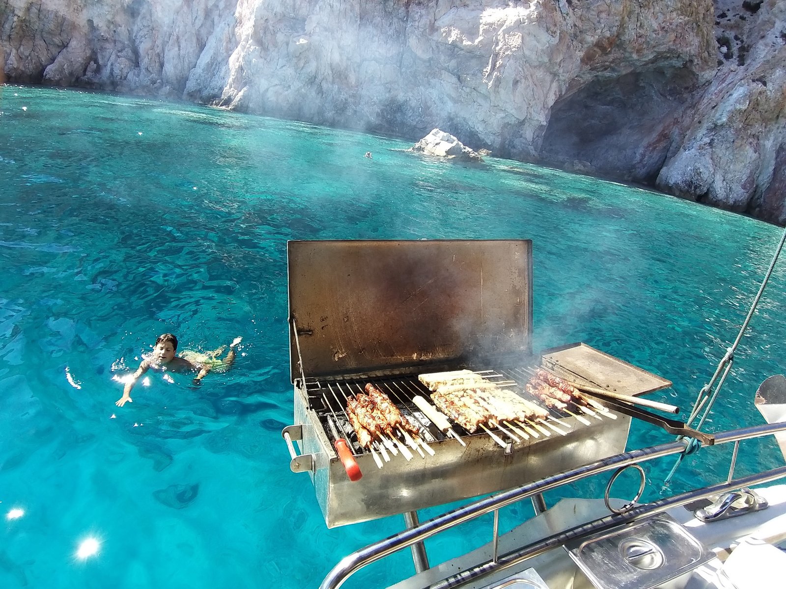 Aπολαύστε ένα υπέροχο μπάρμπεκιου πάνω στο καΐκι συνοδευόμενο από ελληνικούς μεζέδες, ελληνική σαλάτα και καλό κρασί.
