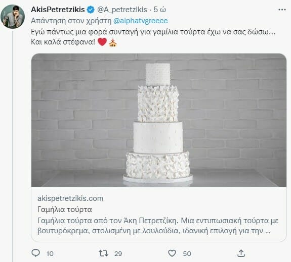 «Εγώ πάντως μια φορά συνταγή για γαμήλια τούρτα έχω να σας δώσω… Και καλά στέφανα!», έγραψε ο Πετρετζίκης με αρκετή δόση χιούμορ.