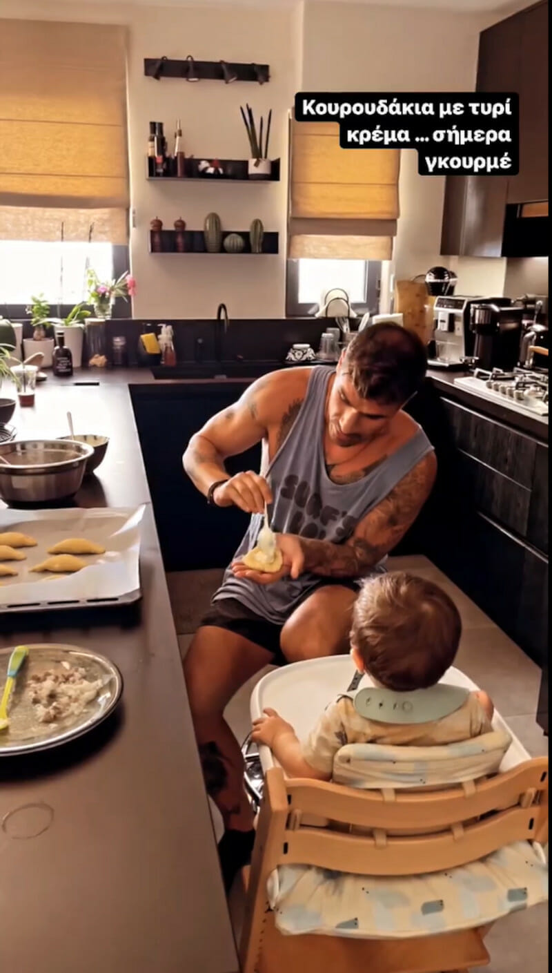Ο μικρός Αχιλλέας παρακολουθούσε με απόλυτη προσοχή τον πατέρα του να φτιάχνει κουρουδάκια με τυρί κρέμα.