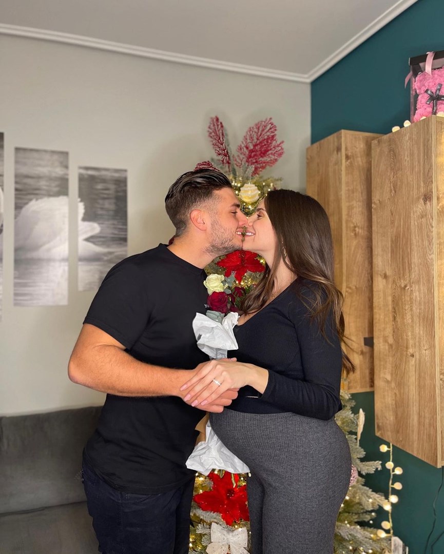 Ο Αλέξανδρος και η Σοφία ποζάρουν αγκαλιασμένοι και ερωτευμένοι στο σπίτι, με τη μέλλουσα μανούλα να μας δείχνει το μονόπετρο στο χέρι της.