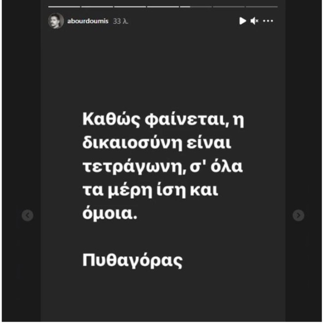 Στην πρώτη του ανάρτηση στα InstaStories πόσταρε μια φράση του Πυθαγόρα γράφοντας: «Καθώς φαίνεται η δικαιοσύνη είναι τετράγωνη, σ’ όλα τα μέρη ίση και όμοια».