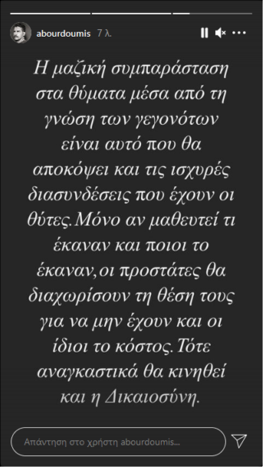 «Η μαζική συμπαράσταση στα θύματα μέσα από τη γνώση των γεγονότων είναι αυτό που θα αποκόψει και τις ισχυρές διασυνδέσεις που έχουν οι θύτες. Μόνο αν μαθευτεί τι έκαναν και ποιοι το έκαναν, οι προστάτες θα διαχωρίσουν τη θέση τους για να μην έχουν και οι ίδιοι το κόστος. Τότε αναγκαστικά θα κινηθεί η Δικαιοσύνη».