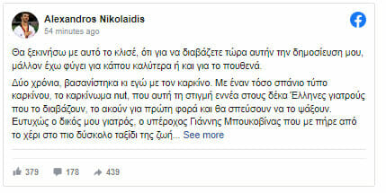 Δύο χρόνια, βασανίστηκα κι εγώ με τον καρκίνο. Με έναν τόσο σπάνιο τύπο καρκίνου, το καρκίνωμα nut, που αυτή τη στιγμή εννέα στους δέκα Έλληνες γιατρούς που το διαβάζουν, το ακούν για πρώτη φορά και θα σπεύσουν να το ψάξουν. Ευτυχώς ο δικός μου γιατρός, ο υπέροχος Γιάννης Μπουκοβίνας που με πήρε από το χέρι στο πιο δύσκολο ταξίδι της ζωής μου, τον γνώριζε αυτόν τον σπάνιο τύπο και έκανε τα πάντα για να με σώσει ή να μου χαρίσει λίγη παραπάνω ζωή. Κίνησε γη και ουρανό, να φέρει φάρμακα κυριολεκτικά από την άλλη άκρη της γης για να τα δοκιμάσω.