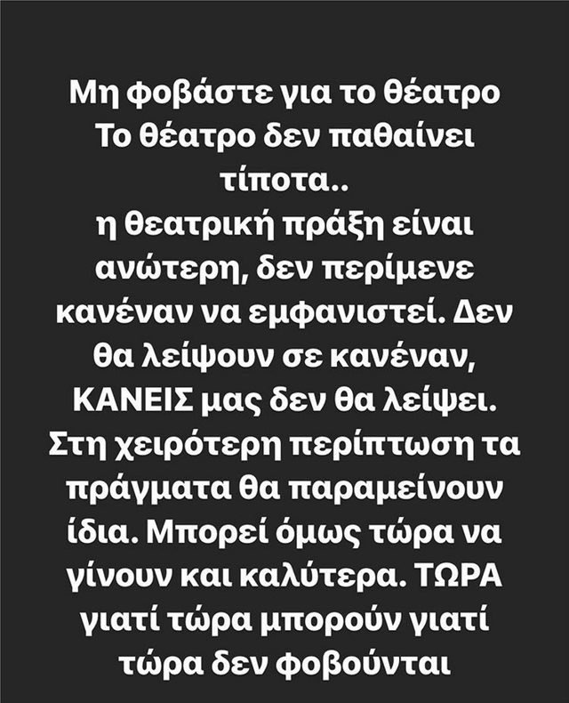 Έγραψε χαρακτηριστικά: «Μη φοβάστε για το θέατρο. Το θέατρο δεν παθαίνει τίποτα… Η θεατρική πράξη είναι ανώτερη, δεν περίμενε κανέναν για να εμφανιστεί.».