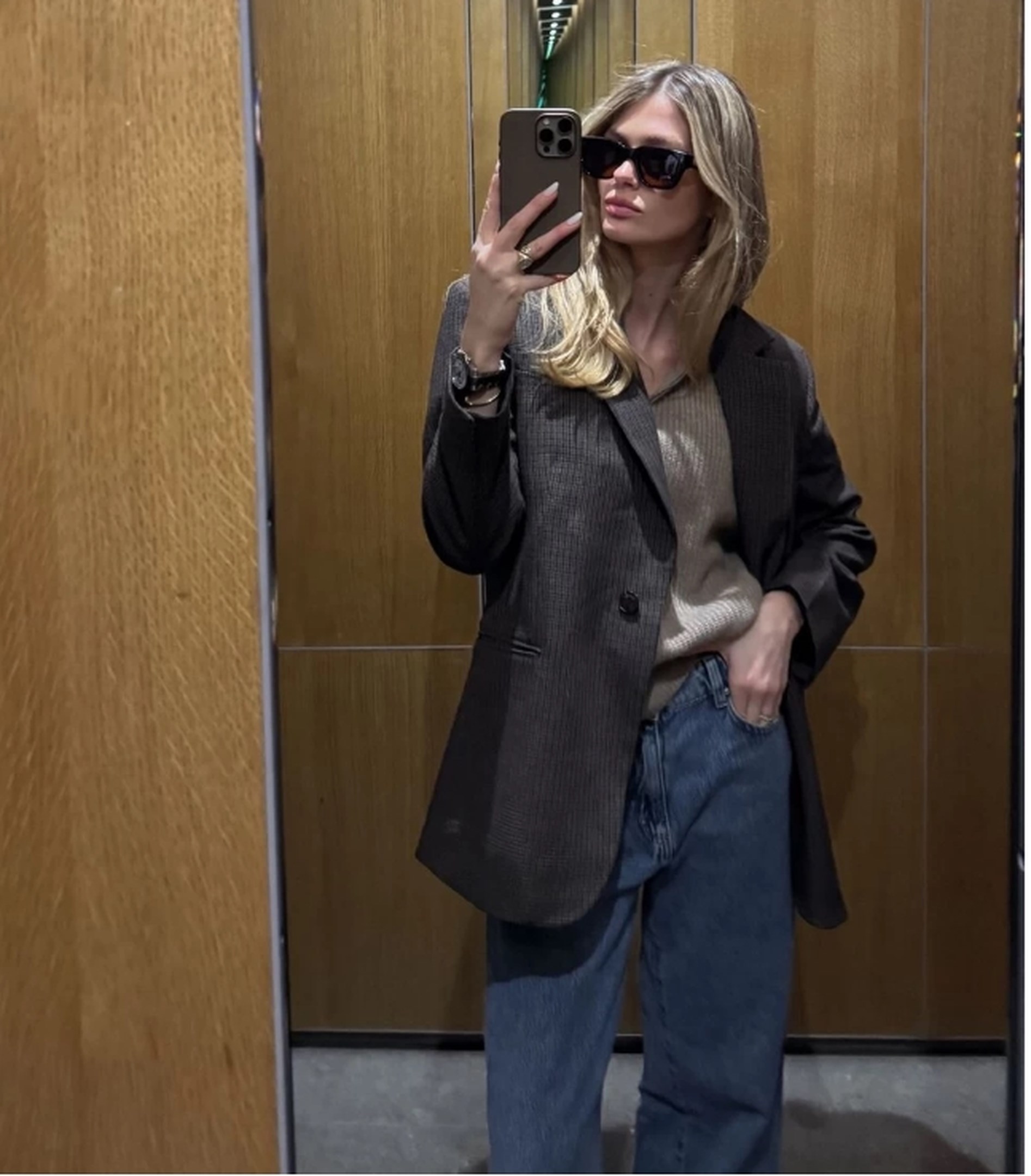 Στη συγκεκριμένη φωτογραφία, η Κωστοπούλου φοράει το cool business look της, με oversized καρό blazer σε καφέ και γκρι τόνους, το οποίο συνδύασε με πολύ φαρδύ baggy τζιν παντελόνι σε ίσια γραμμή. Η ίδια συνήθως αποφεύγει το μακιγιάζ το πρωί, αλλά φροντίζει να είναι καλοχτενισμένα τα μαλλιά της.