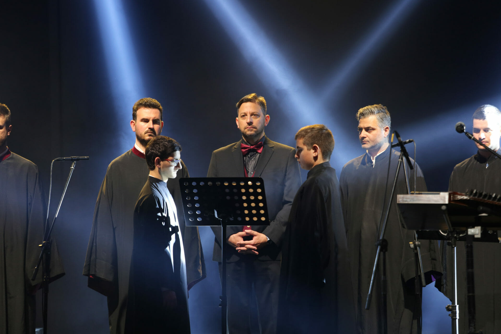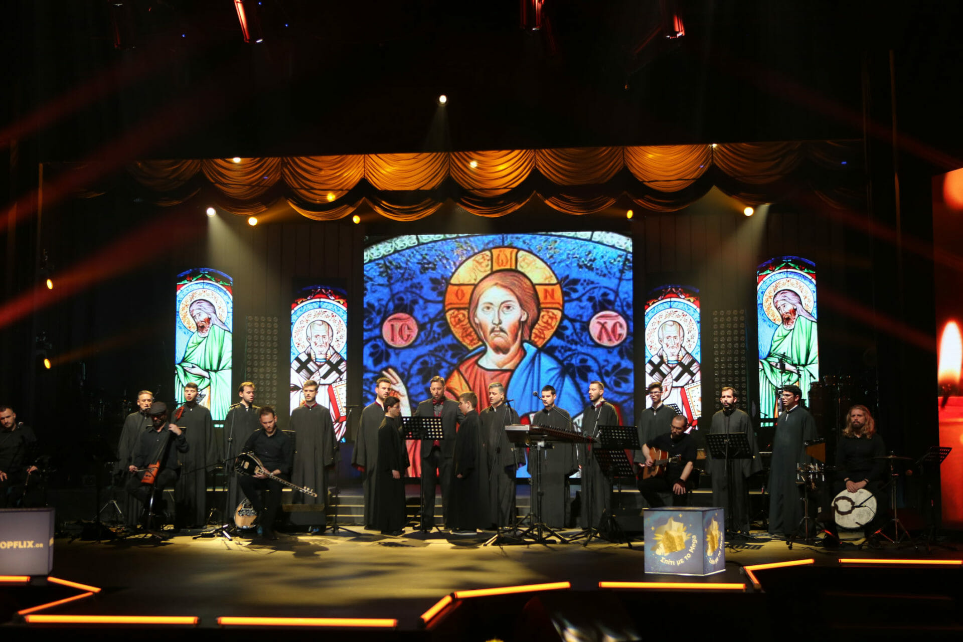 Η βραδιά ξεκινάει στις 23:00 με τον Βυζαντινό Χορό του Ιερού Ναού Αγίου Διονυσίου Αρεοπαγίτου, Πολιούχου Αθηνών. Μαζί με τον Γεράσιμο Ανδρεάτο και τη Σοφία Μάνου, και υπό τη διεύθυνση του μαέστρου Γιώργου Δεμελή, η χορωδία θα ψάλλει ύμνους και τραγούδια σε κλίμα κατάνυξης. Στις 23:50 θα συνδεθούμε με τον Ιερό Καθεδρικό Ναό Αγίας Τριάδος Πειραιώς για να παρακολουθήσουμε την