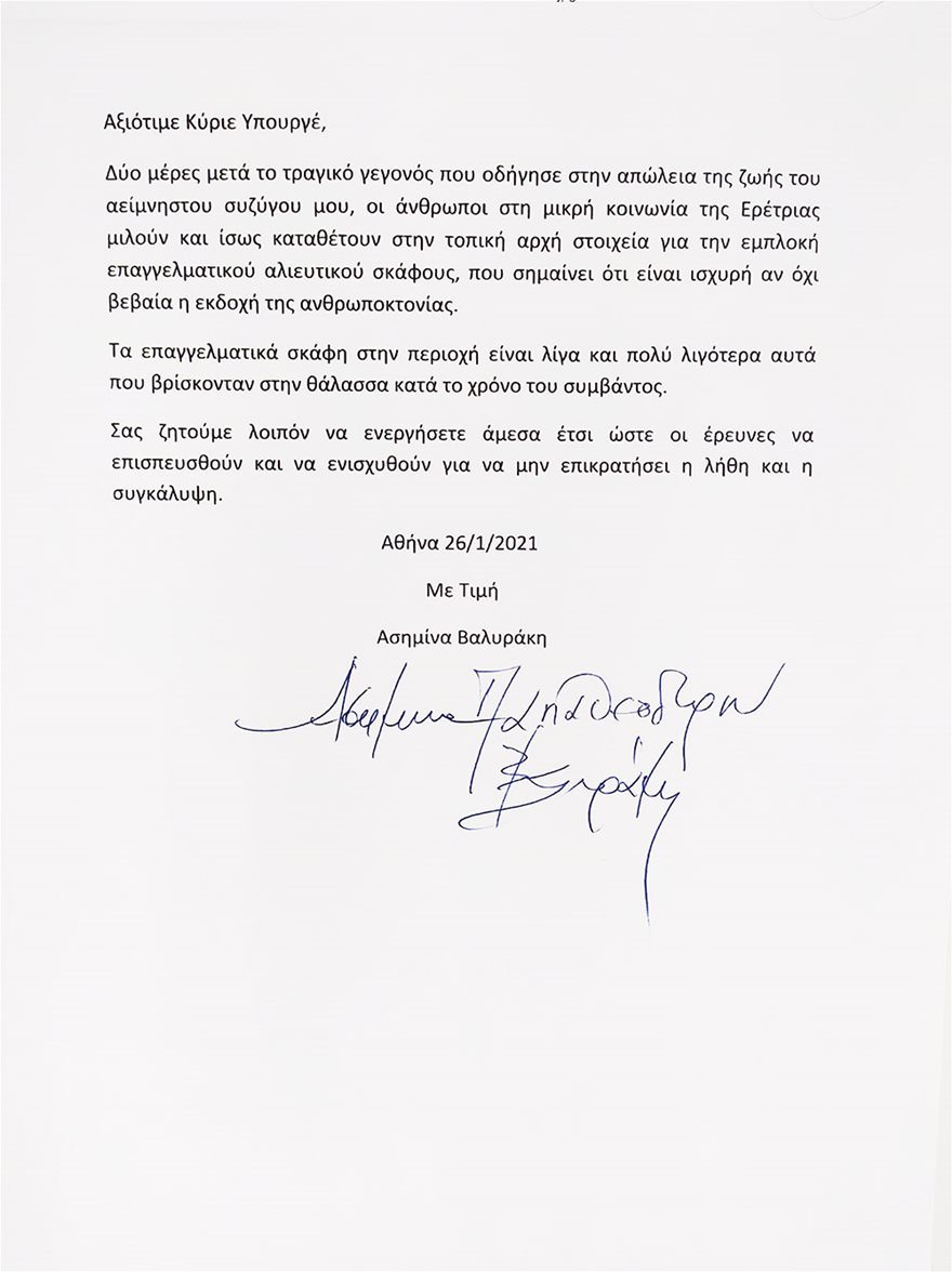 Σε επιστολή της προς τον υπουργό Ναυτιλίας, αναφέρει «Οι άνθρωποι στη κοινωνία της Ερέτριας μιλούν και ίσως καταθέτουν στις αρχές στοιχεία για την εμπλοκή επαγγελματικού αλιευτικού σκάφους. Πράγμα «που σημαίνει ότι είναι ισχυρή, αν όχι βεβαία η εκδοχή της ανθρωποκτονίας».