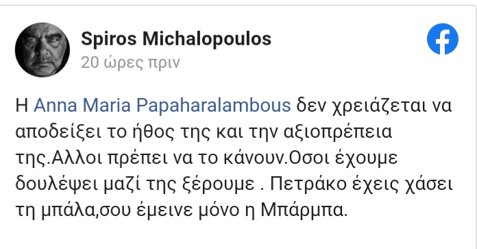 Όσοι έχουμε δουλέψει μαζί της ξέρουμε. Πετράκο έχεις χάσει τη μπάλα, σου έμεινε μόνο η Μπάρμπα», έγραψε χαρακτηριστικά ο Σπύρος Μιχαλόπουλος.