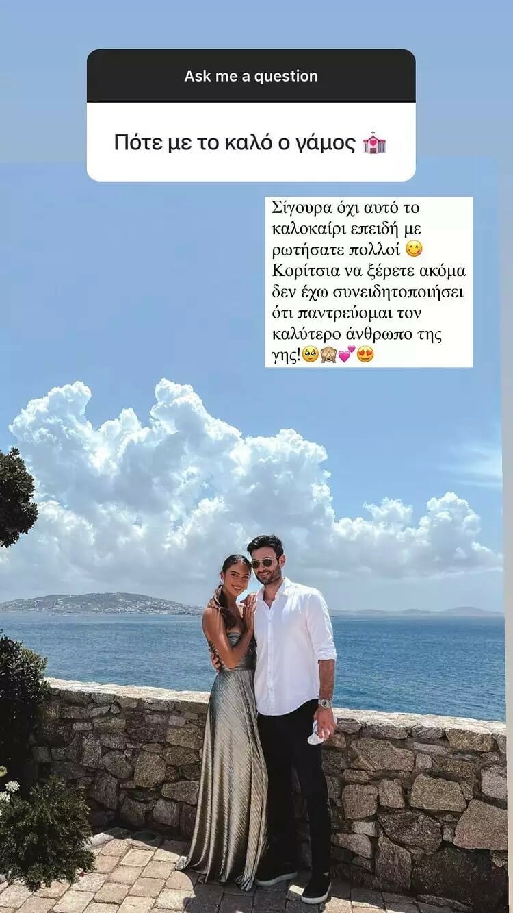 Μια από τις ερωτήσεις που δέχτηκε ήταν για το πότε θα γίνει ο γάμος της με την ίδια να απαντά: «Σίγουρα όχι αυτό το καλοκαίρι επειδή με ρωτήσατε πολλοί. Κορίτσια να ξέρετε ακόμα δεν έχω συνειδητοποιήσει ότι παντρεύομαι τον καλύτερο άνθρωπο της γης».
