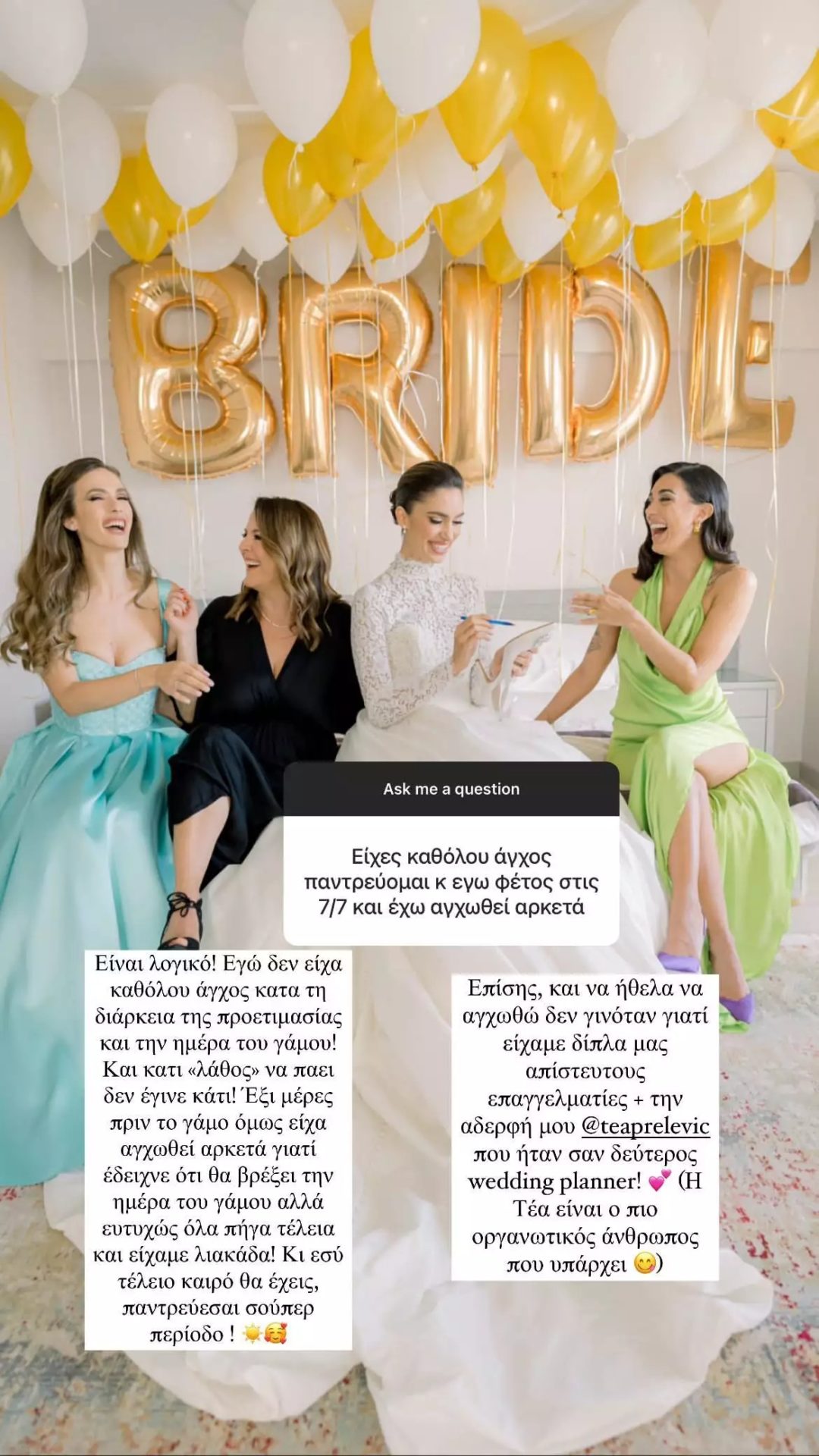 Η Άννα Πρέλεβιτς, αφού χαλάρωσε με τις γαμήλιες προετοιμασίες και τη μεγάλη ημέρα, αποφάσισε να απαντήσει σε όλες τις ερωτήσεις των διαδικτυακών της φίλων στο Instagram και να αποκαλύψει λεπτομέρειες από τον γάμο της με τον Νικήτα Νομικό.