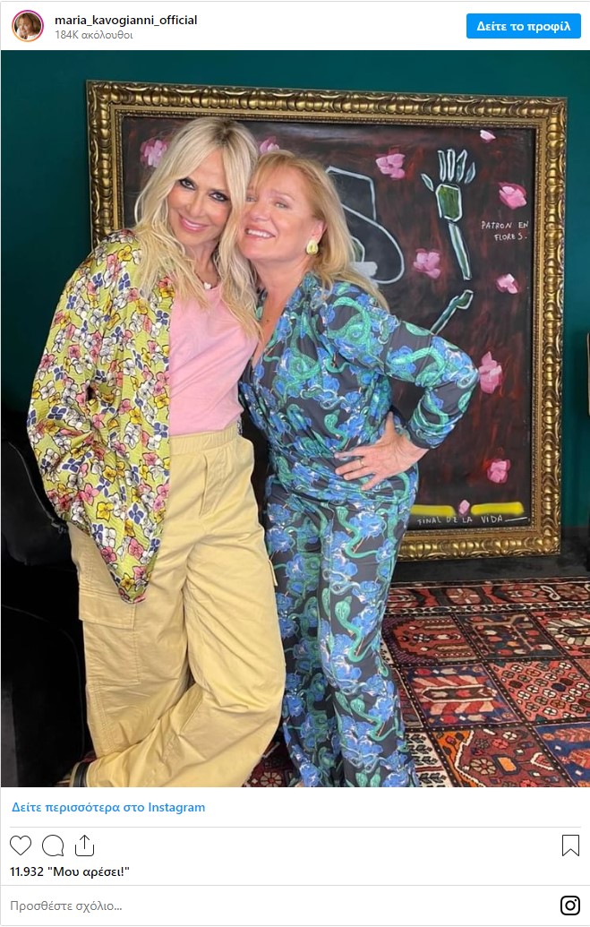 Ανάρτηση από τη συνάντησή της με την Άννα Βίσση έκανε και η Μαρία Καβογιάννη, «ανεβάζοντας» στο προφίλ της στο Instagram μία φωτογραφία τους, και γράφοντας στη λεζάντα της δημοσίευσής της «Σαν και εσένα καμιά φιλεναδίτσα μου» -ατάκα-αναφορά στην ομώνυμη μεγάλη επιτυχία της τραγουδίστριας από τη δεκαετία των 80’s, «Σαν και εμένα καμιά».