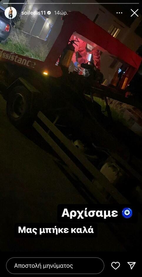 Από τη δική του πλευρά, ο πρώην παίκτης του Survivor έκανε ποστ και έδειχνε την οδική βοήθεια να τραβά το αυτοκίνητο στο οποίο επέβαιναν με την αγαπημένη του: «Αρχίσαμε. Μας μπήκε καλά», έγραψε.