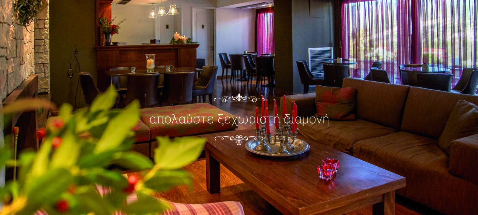Στον χώρο του lobby- bar, θα απολύσετε το πλούσιο πρωινό, τον καφέ η το ποτό σας, σε καλαίσθητο χώρο ανάπαυσης και χαλάρωσης, με τζάκι (για τον Χειμώνα) και την υπέροχη θέα, είτε επιλέξετε να καθίσετε έξω το Καλοκαίρι η μέσα το Χειμώνα.