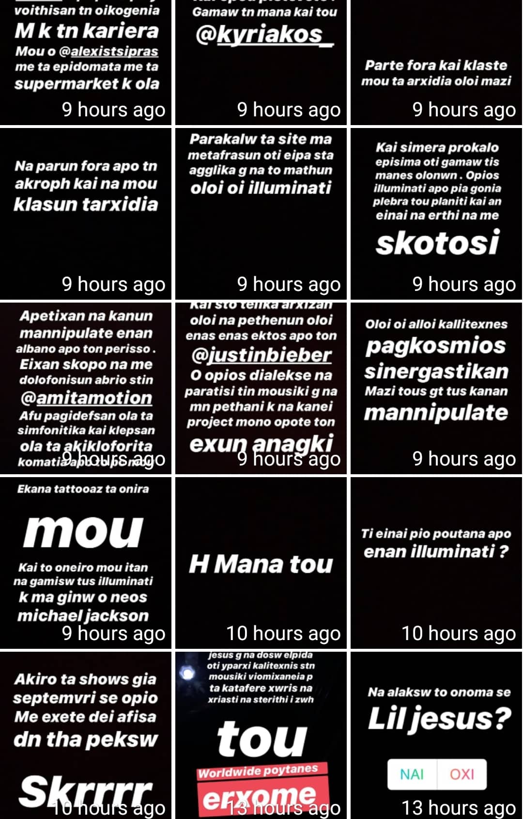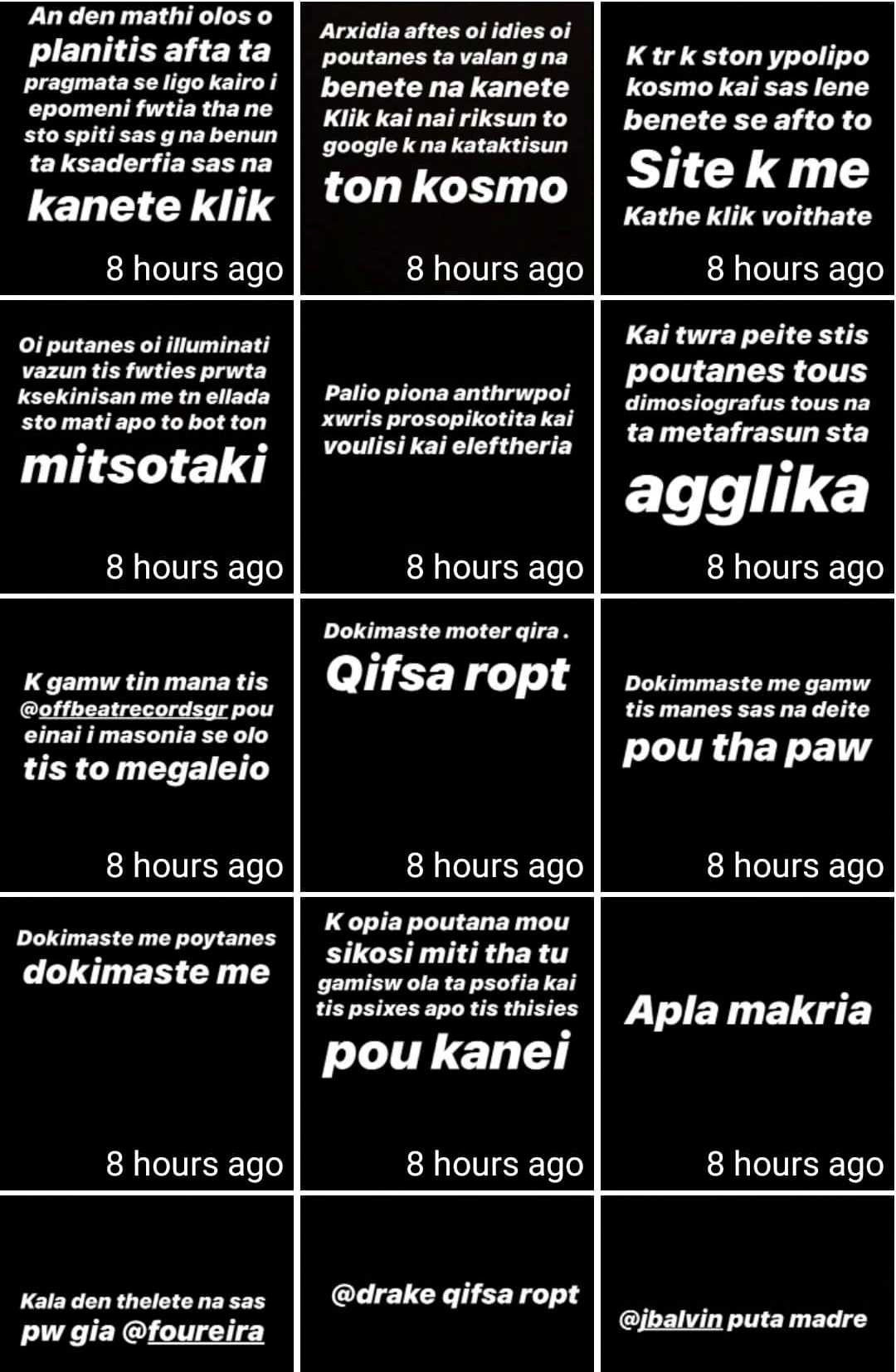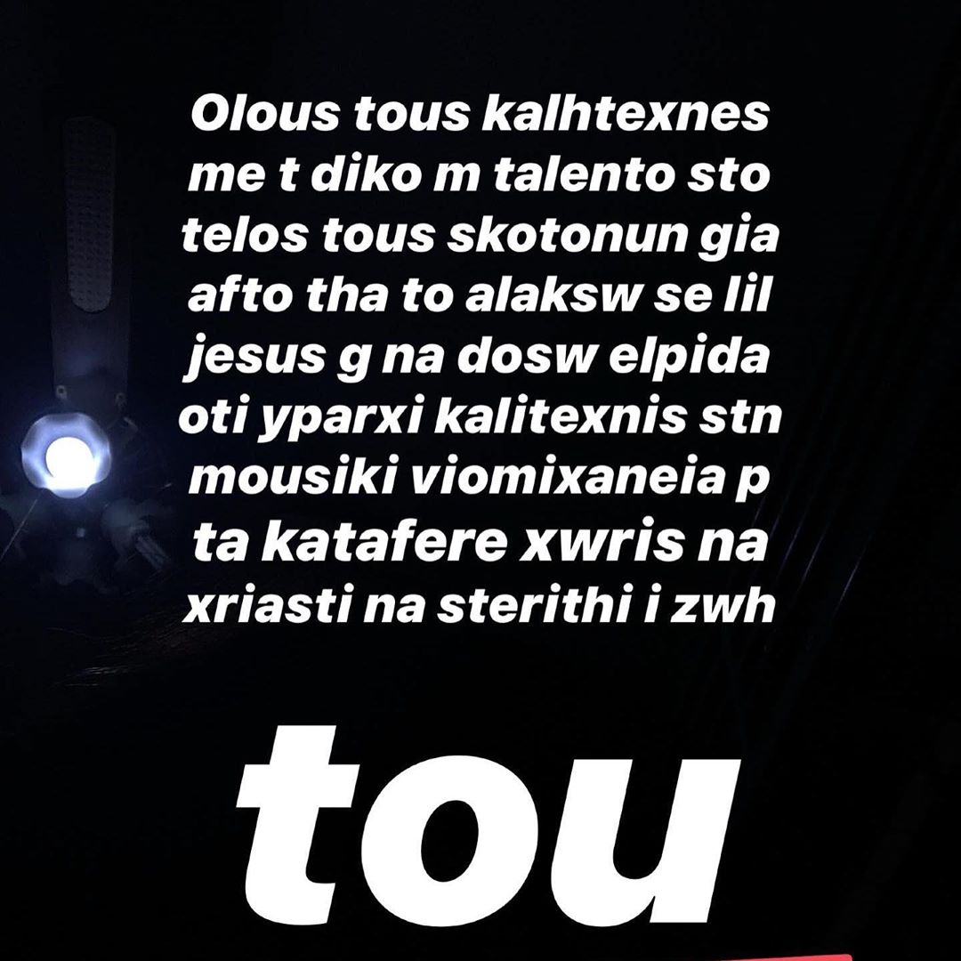 Με 76 αναρτήσεις στο Instagram μέσα σε μια νύχτα λοιπόν στράφηκε εναντίον του Κυριάκου Μητσοτάκη, της Φουρέιρα και των ιλουμινάτι και άλλαξε το όνομα του λογαριασμού του στο Instagram σε Lil jesus. Η αλήθεια είναι πως ο λόγος του δεν είχε καμία συνοχή, ωστόσο από τα δεκάδες stories που ανέβηκαν στο Instagram ήταν σαφές πως στόχευε συγκεκριμένα άτομα.