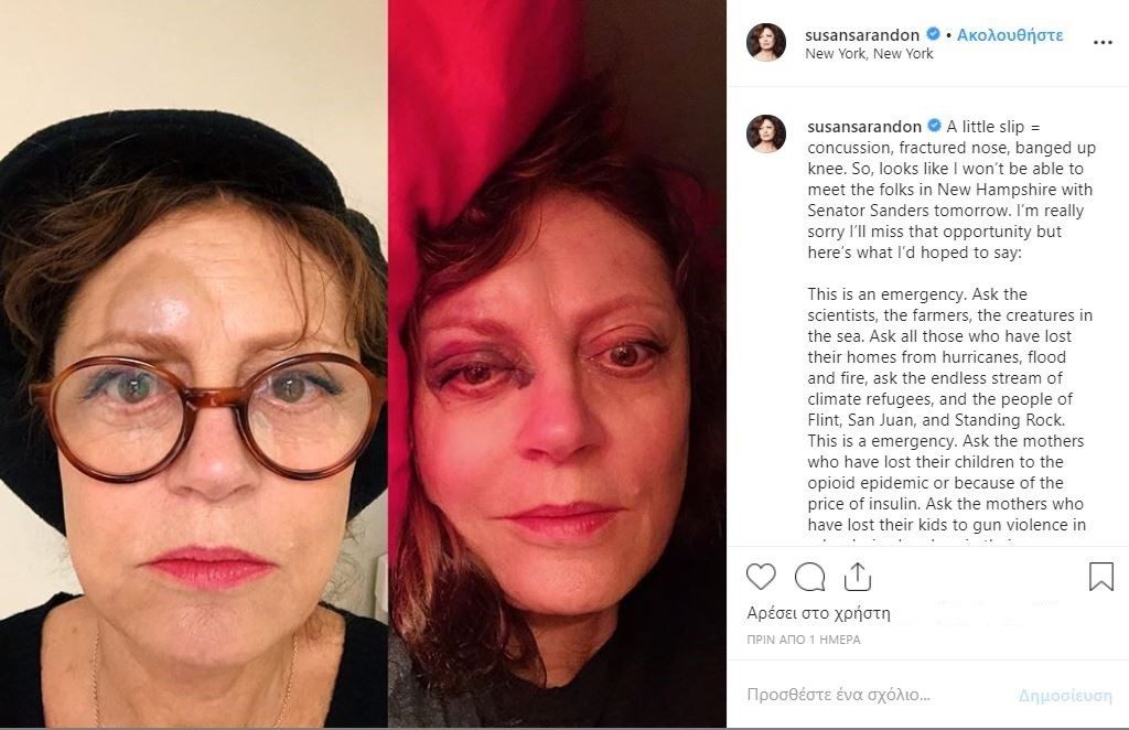Και οι σταρ έχουν τα ατυχήματα τους. Κάποιες φορές μάλιστα τα αποκαλύπτουν και οι ίδιοι μέσα από τα social media. Αυτό έγινε και με την Σούζαν Σαράντον, όταν μία απλή πτώση της προκάλεσε διάσειση, σπασμένη μύτη και χτύπημα στο γόνατο. Η διάσημη ηθοποιός ανέβασε στο instagram δύο φωτογραφίες της και το μοιράστηκε με τους θαυμαστές της παρά το γεγονός ότι φαίνεται το πρόσωπό της παραμορφωμένο από τα χτυπήματα, με πρησμένο μέτωπο, μελανιασμένα μάτια και μύτη. Η Χολιγουντιανή σταρ εξέφρασε τη λύπη της. Καθώς μετά την πτώση της ακυρώθηκε το ραντεβού που είχε με τον Γερουσιαστή Σάντερς. Στον οποίο θα εξέθετε τους κοινωνικούς προβληματισμούς της αφού η ίδια είναι και ακτιβίστρια. Στην ανάρτησή της η Σαράντον κάνει λόγο για έκτακτη ανάγκη του πλανήτη και της κοινωνίας. Επισημαίνει πως οι επείγουσες καταστάσεις απαιτούν τολμηρή και γεμάτη όραμα ηγεσία εκφράζοντας παράλληλα τη στήριξή της στον Σάντερς: «Ο Γερουσιαστής Σάντερς πιστεύει σ’ εμάς και πως όλοι μαζί είναι δυνατός ένας καλύτερος κόσμος. Παλεύει για την κοινωνική, φυλετική και οικονομική δικαιοσύνη όλη του τη ζωή, πολύ καιρό προτού διεκδικήσει την Προεδρία, προτού γίνει αποδεκτός. Τώρα είναι η στιγμή να παλέψουμε για εκείνον».