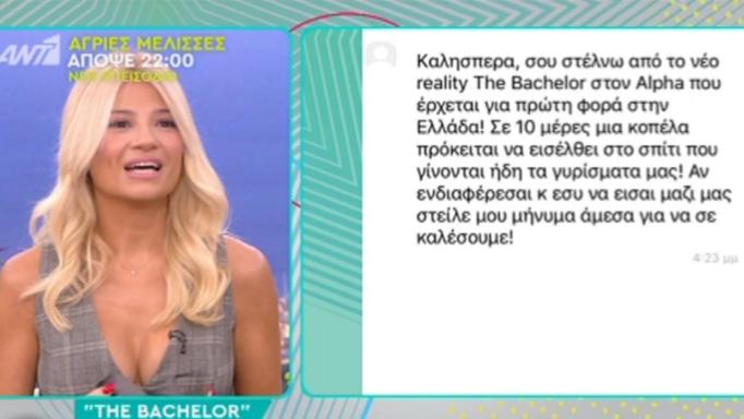 Παράλληλα, το «Πρωινό» παρουσίασε το μήνυμα που έλαβαν κάποιες κοπέλες του Bachelor προκειμένου να βρεθούν σε αυτό. «Καλησπέρα, σου στέλνω από το νέο ριάλιτι The Bachelor στον Alpha που έρχεται για πρώτη φορά στην Ελλάδα! Σε 10 μέρες μια κοπέλα πρόκειται να εισέλθει στο σπίτι που γίνονται ήδη τα γυρίσματα μας! Αν ενδιαφέρεσαι και εσύ να είσαι μαζί μας, στείλε μου μήνυμα άμεσα για να σε καλέσουμε».