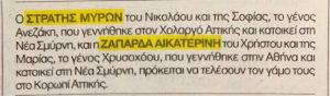 Σύμφωνα με τα όσα λέει η αγγελία του γάμου ο Μύρωνας Στρατής και η μέλλουσα σύζυγος του θα τελέσουν το γάμο τους στο Κορωπί.