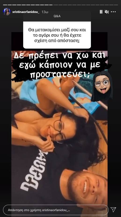 «Θα μετακομίσει μαζί σου το αγόρι σου ή θα έχετε σχέση από απόσταση;», τη ρώτησε κάποιος διαδικτυακός της φίλος, με τη Χριστίνα Ορφανίδου να απαντά: «Δεν πρέπει να έχω κι εγώ κάποιον να με προστατεύει;».