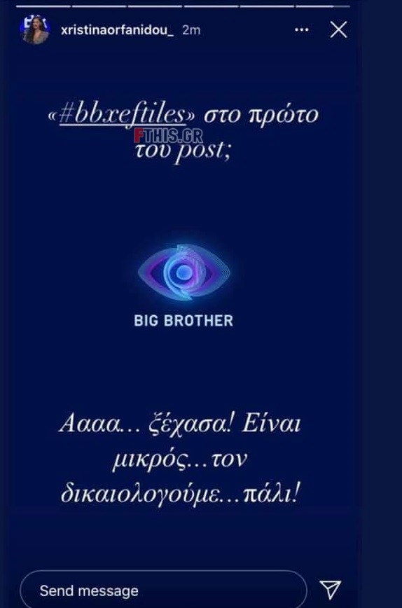 Η Χριστίνα Ορφανίδου σε νέα της ανάρτηση «κάρφωσε» τον Παναγιώτη Βαρουξή, γράφοντας χαρακτηριστικά: «#bbxeftiles στο πρώτο του ποστ; Αααα… ξέχασα. Είναι μικρός… τον δικαιολογούμε… πάλι».
