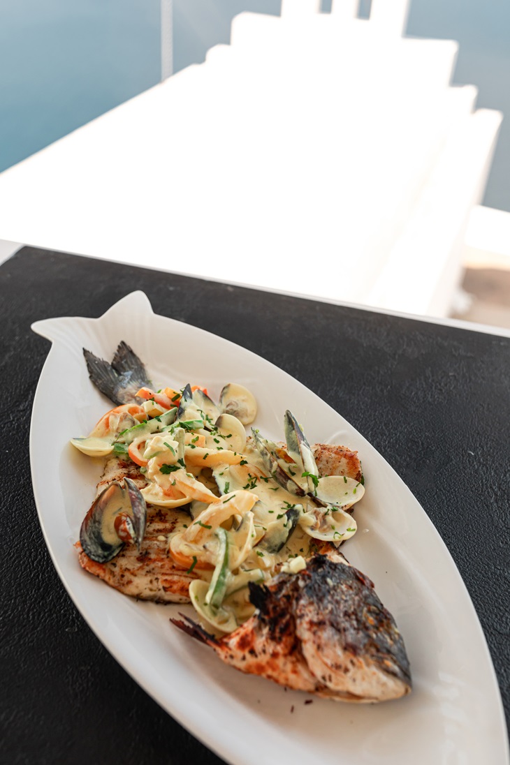 Σερβίρονται παραδοσιακές ελληνικές και κυκλαδίτικες σπεσιαλιτέ, καθώς και μια ποικιλία από διεθνή πιάτα, όλα φτιαγμένα με τα πιο φρέσκα και υψηλής ποιότητας υλικά. Το μενού περιλαμβάνει εξαιρετικά θαλασσινά, φρέσκα ψάρια και λαχταριστό αστακό, προσφέροντας μια αυθεντική γεύση της Μεσογείου.