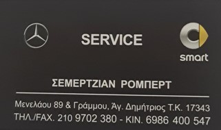 Με αξιοπιστία και συνέπεια, το εξειδικευμένο συνεργείο αναλαμβάνει service αυτοκινήτων Mercedes και Smart, έλεγχο ΚΤΕΟ και άλλες υπηρεσίες. Διατηρήστε το αυτοκίνητό σας σε άριστη κατάσταση. Απευθυνθείτε στον κ. Ρόμπερτ Σεμερτζιάν.