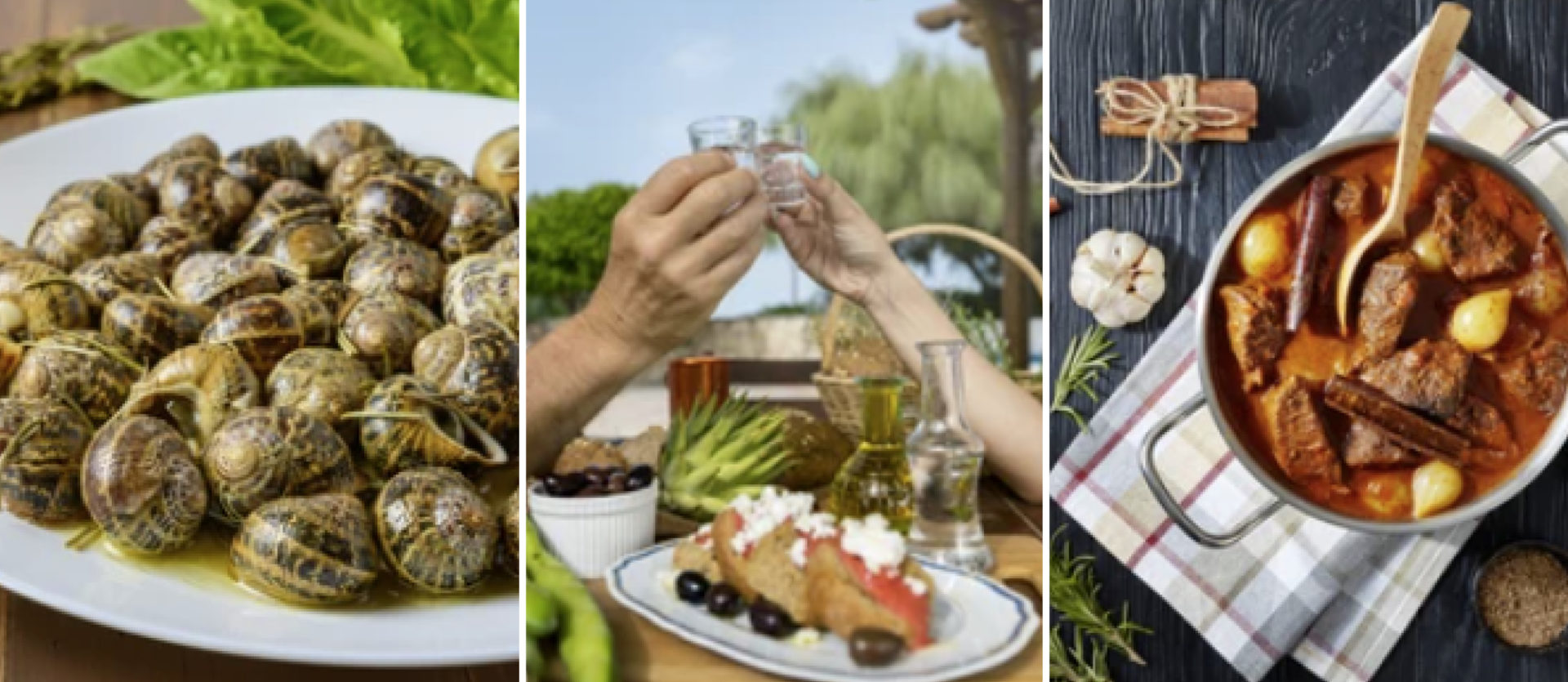 Χοχλιοί μπουρμπουριστοί, ντάκος, καλτσούνια, γαμοπίλαφο, αβγά με στάκα, κατσίκι τσιγαριαστό είναι μερικά από τα παραδοσιακά κρητικά πιάτα που υμνούν την κρητική κουζίνα.
