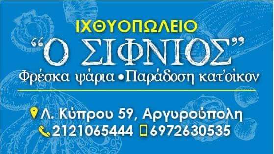 Ο Σιφνιός – Ιχθυοπωλείο Ο Σιφνιός είναι μια υπέροχη επιλογή στην Αργυρούπολη για φρέσκα ψάρια και θαλασσινά εξαιρετικής ποιότητας. Επίσης, προσφέρουμε καθάρισμα, μαγείρεμα ή ψήσιμο του ψαριού μπροστά σας!