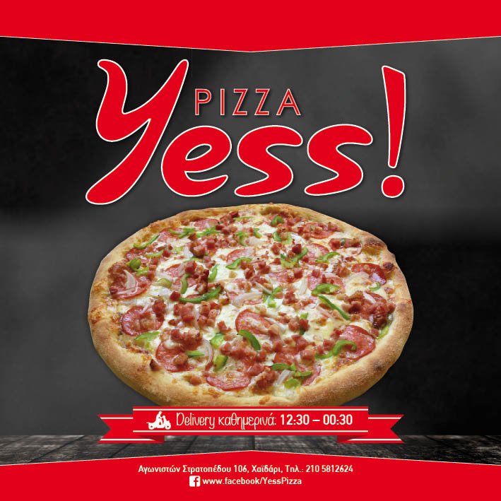 ΑΓΩΝΙΣΤΩΝ ΣΤΡΑΤΟΠΕΔΟΥ 106, ΧΑΪΔΑΡΙ, ΤΗΛ. : 210 5812624 Fb.: www.facebook/YessPizza Delivery καθημερινά: 12.30 -00.30