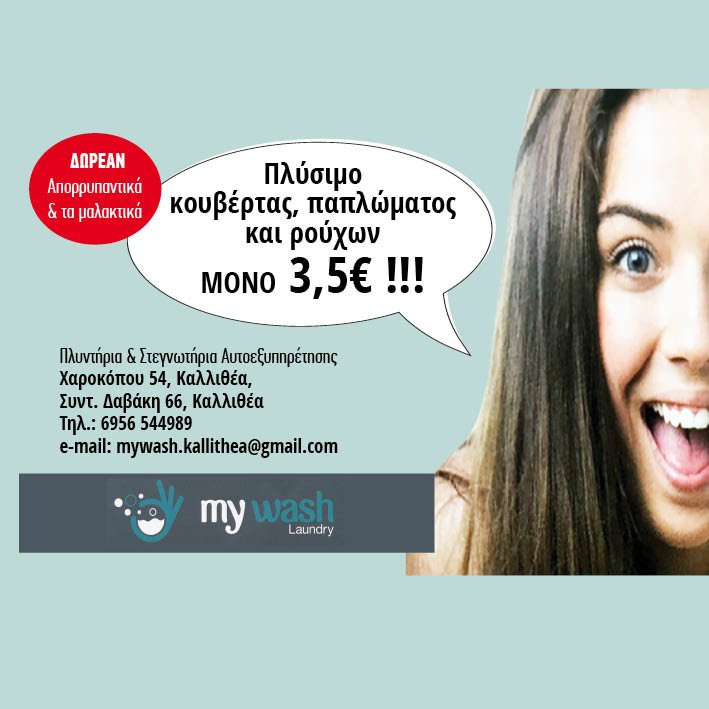 Πλύσιμο κουβέρτας, παπλώματος και ρούχων ΜΟΝΟ 3,5€ !!!   Πλυντήρια & Στεγνωτήρια Αυτοεξυπηρέτησης Χαροκόπου 54, Καλλιθέα Συντ. Δαβάκη 66, Καλλιθέα Τηλ.: 6956 544989 e-mail: [email protected] instagram: mywash.kallithea