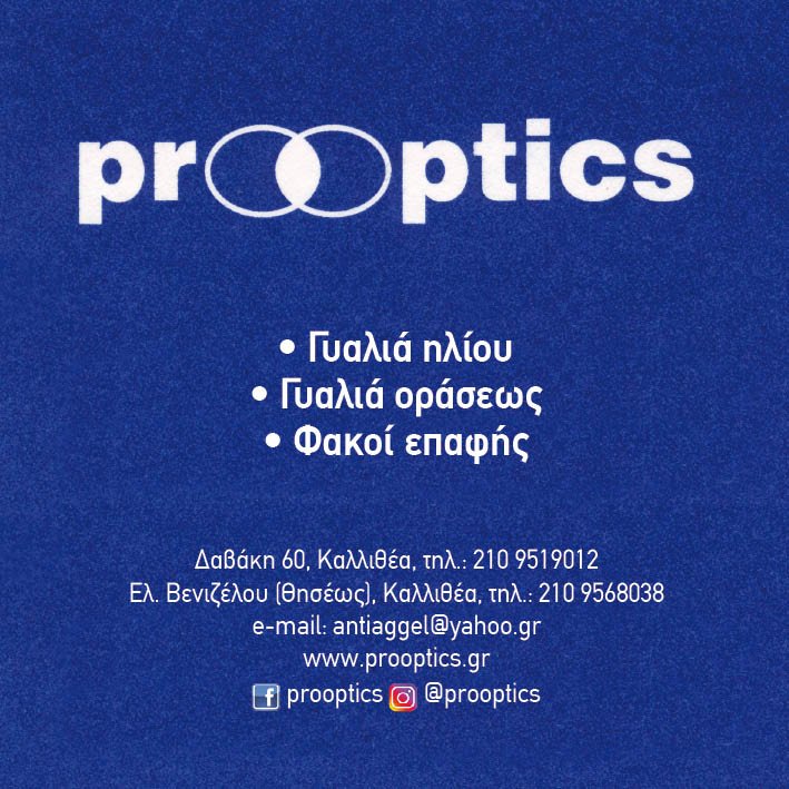Γυαλιά ηλίου Γυαλιά οράσεως Φακοί επαφής   Δαβάκη 60, Καλλιθέα, τηλ.: 210 9519012 Ελ. Βενιζέλου (Θησέως), Καλλιθέα, τηλ.: 210 9568038, e-mail: [email protected] www.prooptics.gr fb: prooptics instagram: @prooptics