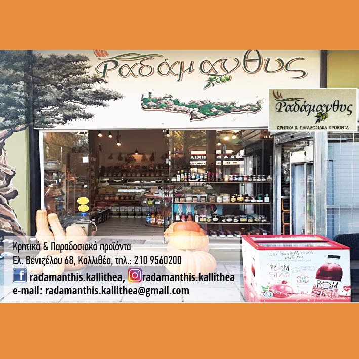 Κρητικά & Παραδοσιακά προϊόντα   Ελ. Βενιζέλου 68, Καλλιθέα, τηλ.: 210 9560200 Fb: radamanthis.kallithea Instagram: radamanthis.kallithea e-mail: [email protected]