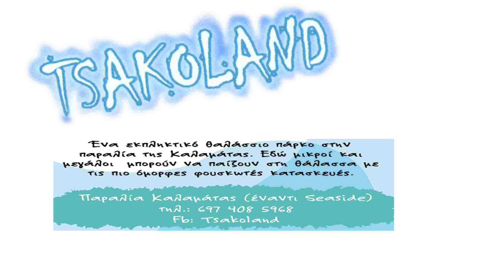 Tsakoland Ένα εκπληκτικό θαλάσσιο πάρκο στην παραλία της Καλαμάτας. Εδώ μικροί και μεγάλοι  μπορούν να παίζουν στη θάλασσα με τις πιο όμορφες φουσκωτές κατασκευές. Παραλία Καλαμάτας (έναντι Seaside), τηλ.: […]