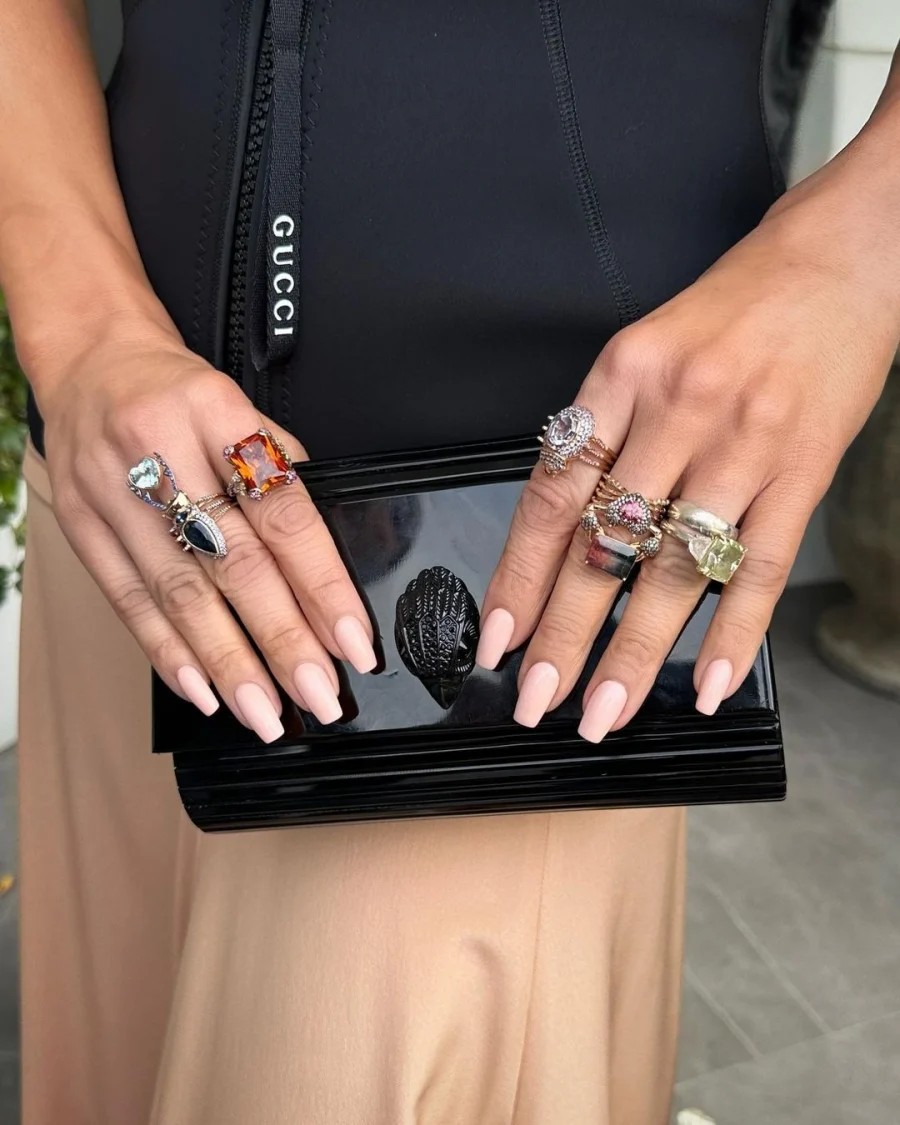 Φυσικά, τα βλέμματα «έπεσαν» στο μανικιούρ της. Το ροδακινί κολακεύει τις λευκές αλλά και τις μαυρισμένες επιδερμίδες και είναι τέλειο για άνοιξη και για καλοκαίρι.