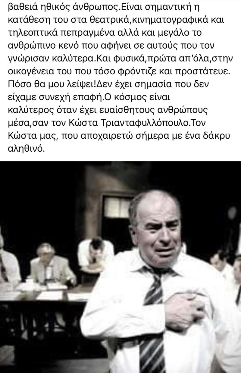 Ανείπωτη θλίψη στον καλλιτεχνικό χώρο προκαλεί η είδηση πως ο Κώστας Τριανταφυλλόπουλος έφυγε ξαφνικά από τη ζωη.