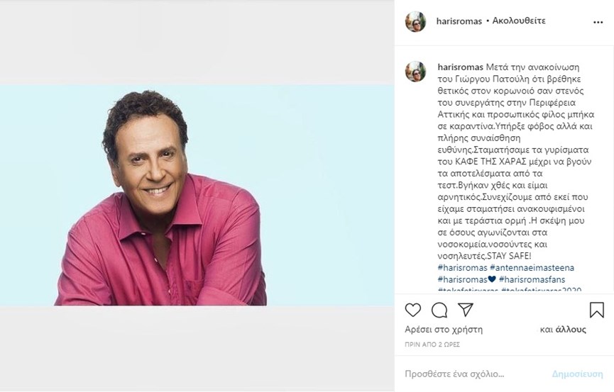 «Μετά την ανακοίνωση του Γιώργου Πατούλη ότι βρέθηκε θετικός στον κορονοιό σαν στενός του συνεργάτης στην Περιφέρεια Αττικής και προσωπικός φίλος μπήκα σε καραντίνα. Υπήρξε φόβος αλλά και πλήρης συναίσθηση ευθύνης. Σταματήσαμε τα γυρίσματα του «Καφέ της Χαράς» μέχρι να βγουν τα αποτελέσματα από τα τεστ. Βγήκαν χθες και είμαι αρνητικός. Συνεχίζουμε από εκεί που είχαμε σταματήσει ανακουφισμένοι και με τεράστια ορμή. Η σκέψη μου σε όσους αγωνίζονται στα νοσοκομεία, νοσούντες και νοσηλευτές. Stay safe», έγραψε χαρακτηριστικά ο Χάρης Ρώμας.