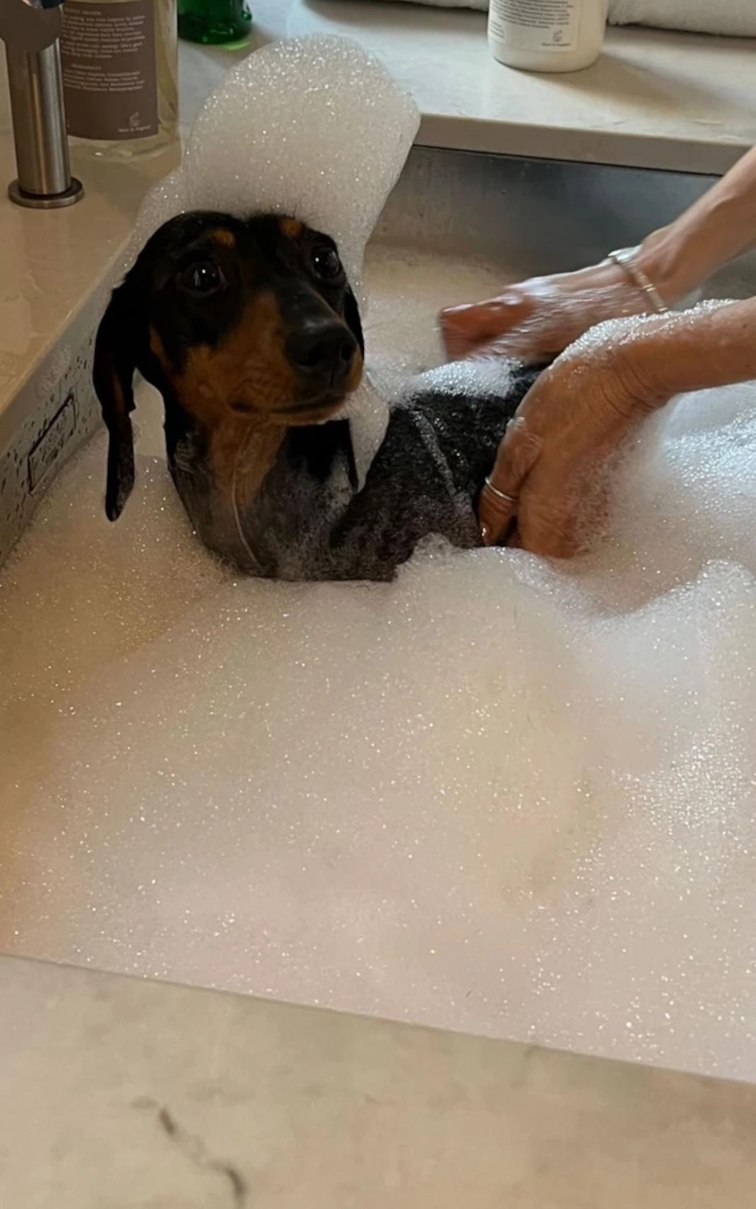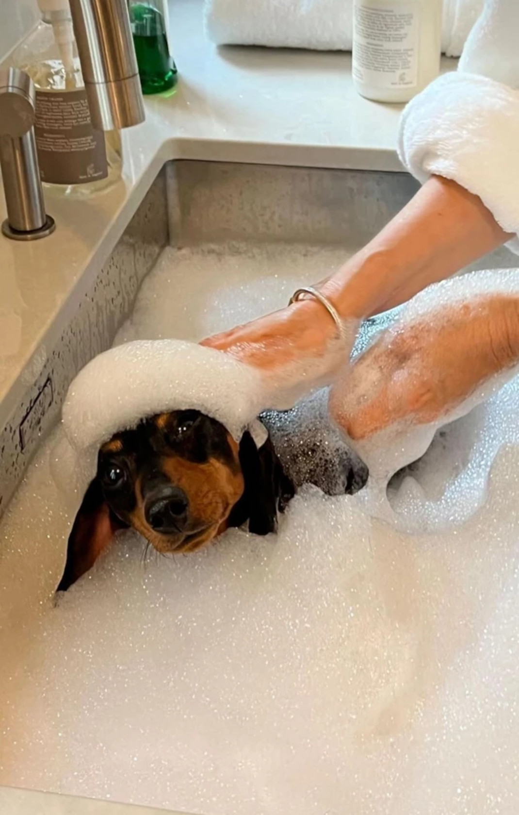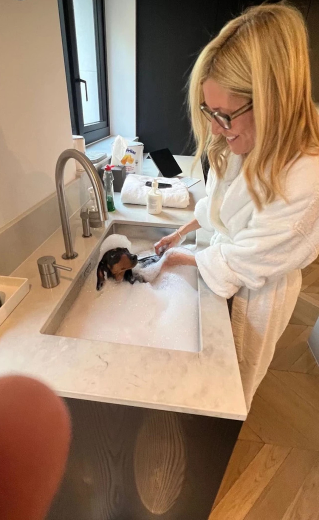 Αυτή τη φορά δημοσίευσε φωτογραφίες της συζύγου του να κάνει μπάνιο τον χαριτωμένο σκύλο τους στον νιπτήρα του μπάνιου. H Mαρί Σαντάλ φροντίζει η ίδια τον σκύλο της οικογένειας και όπως θα δείτε κι εσείς στις παρακάτω φωτογραφίες πλένει μόνη της το κατοικίδιο της, στο μπάνιο του σπιτιού της.