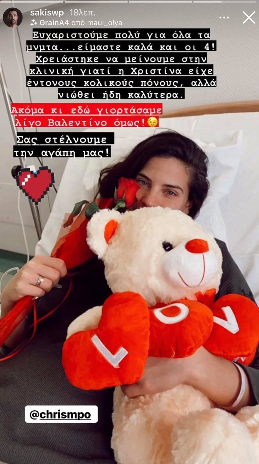 «Ευχαριστούμε πολύ για όλα τα μηνύματα. Είμαστε καλά και οι 4. Χρειάστηκε να μείνουμε στην κλινική γιατί η Χριστίνα είχε έντονους κολικούς πόνους, αλλά νιώθει ήδη καλύτερα. Ακόμη και εδώ γιορτάσαμε λίγο Βαλεντίνο όμως. Σας στέλνουμε την αγάπη μας».