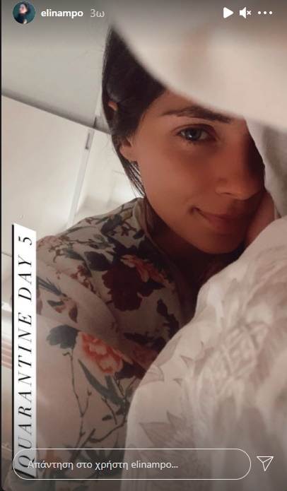 Η ίδια, πόζαρε ξαπλωμένη στο κρεβάτι της και αποκάλυψε ότι είναι σε καραντίνα ήδη πέντε ημέρες. Χωρίς πάντως να διευκρινίζει αν εκείνη έχει προσβληθεί από κορονοϊό ή ήρθε σε επαφή με επιβεβαιωμένο κρούσμα.
